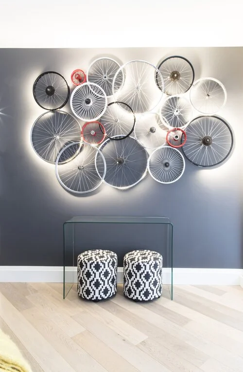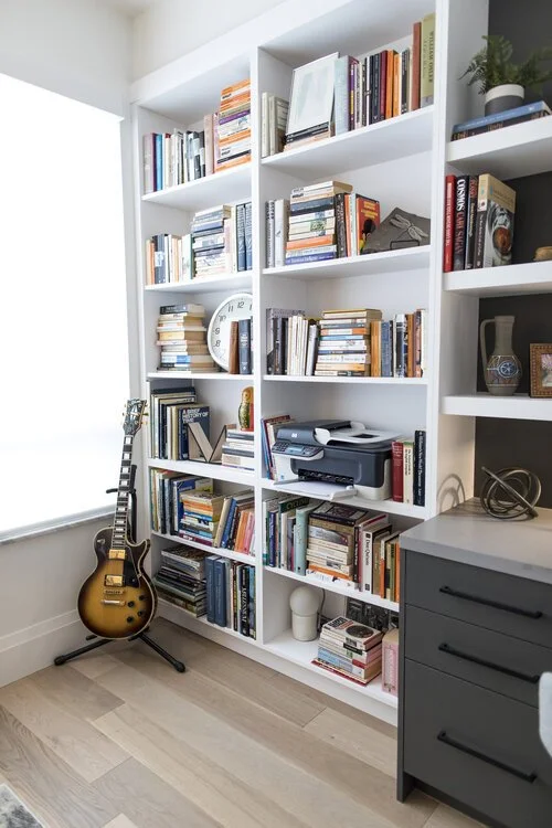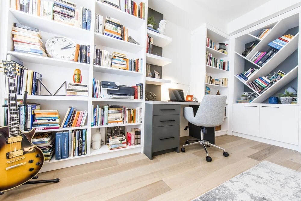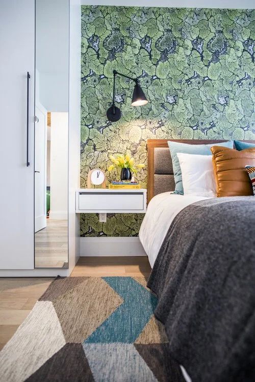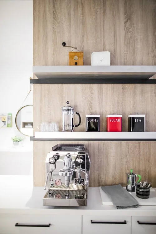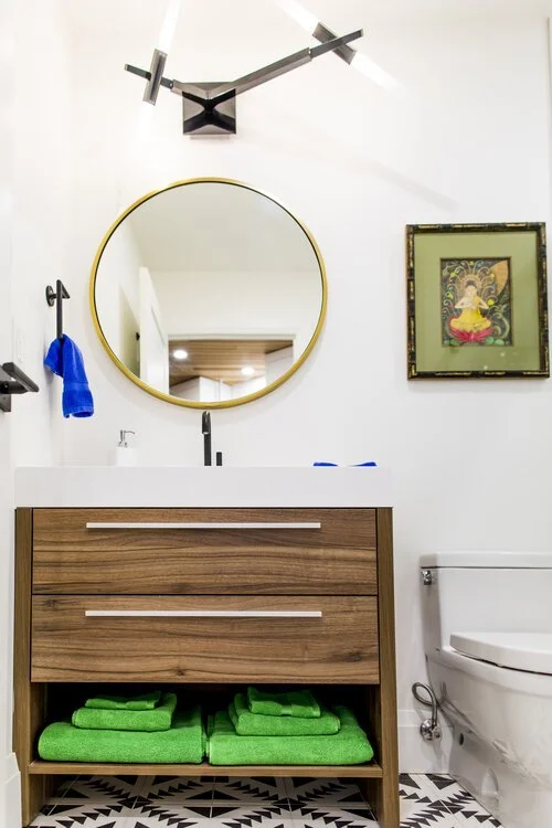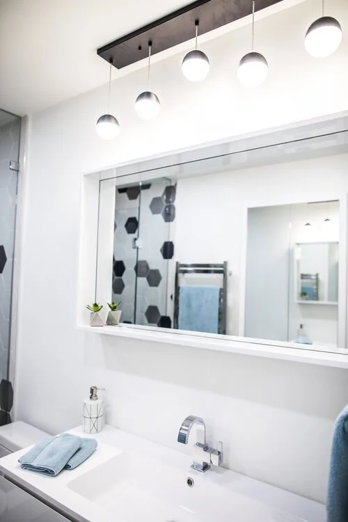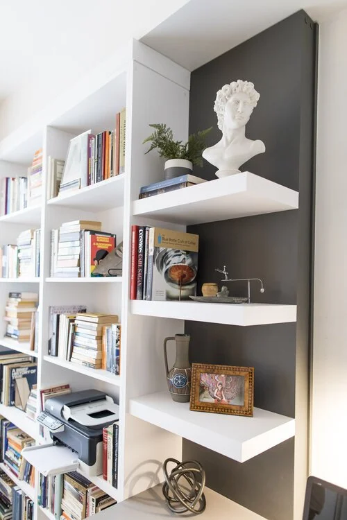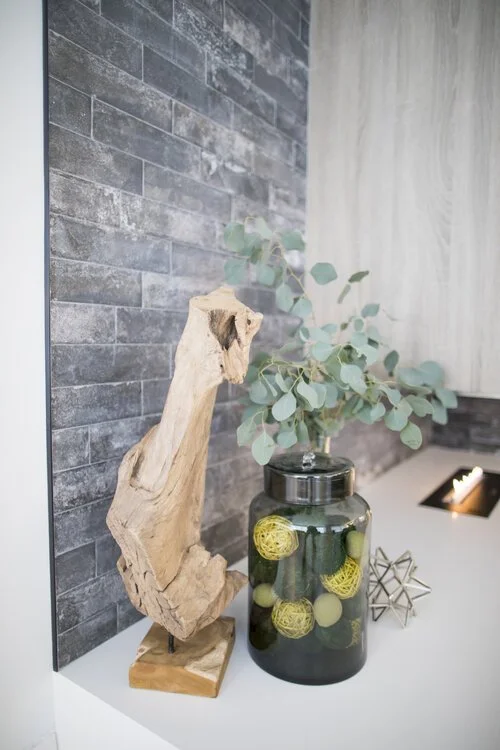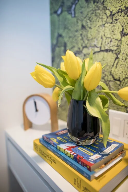 Using contrasting tones of black and white throughout, we warmed up the colourway with lots of warm woods and accents of bright colours.