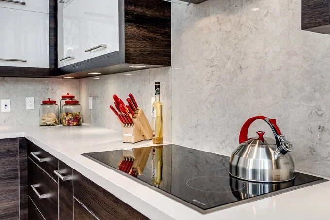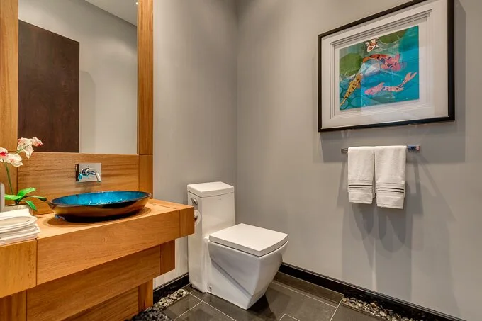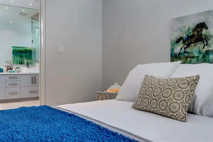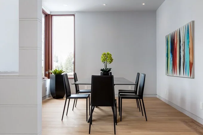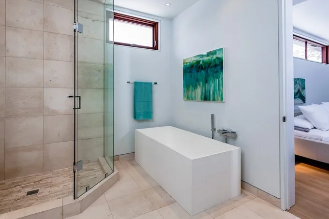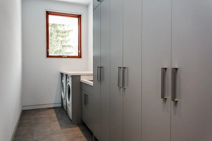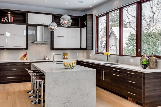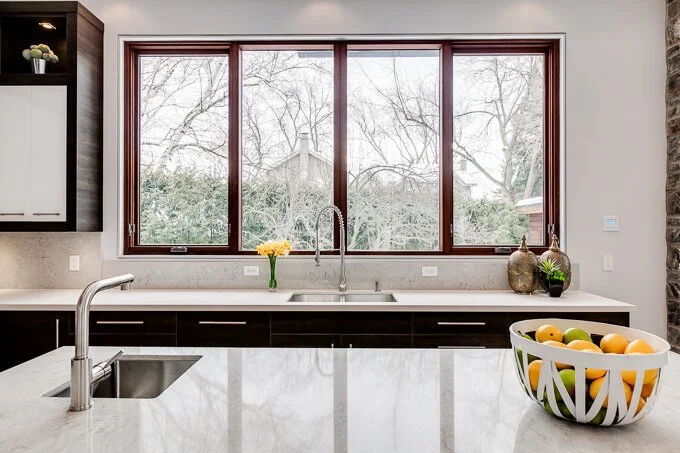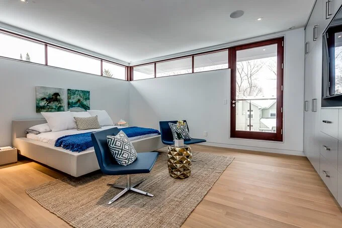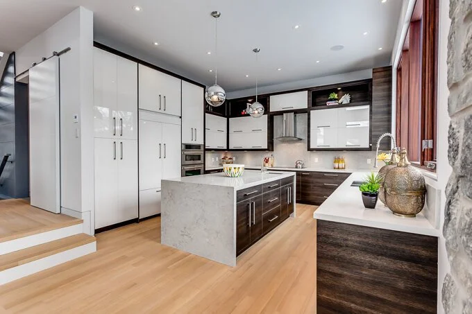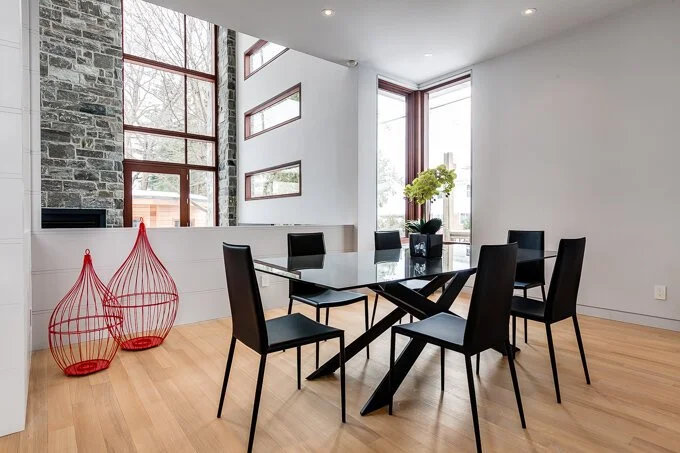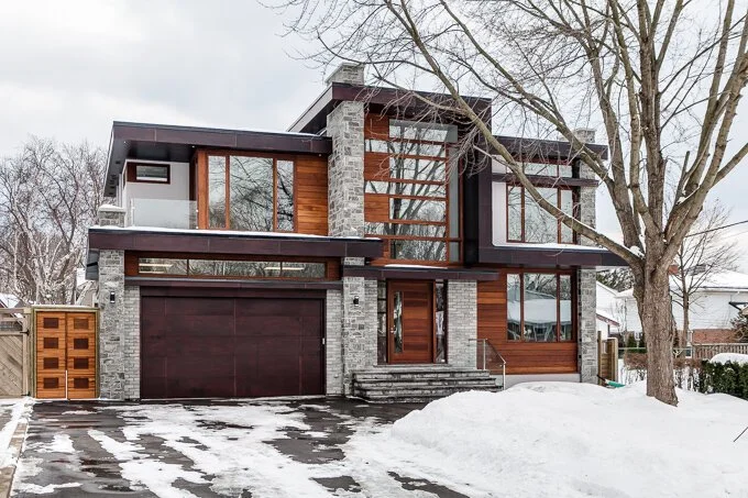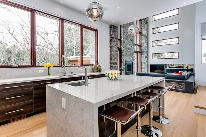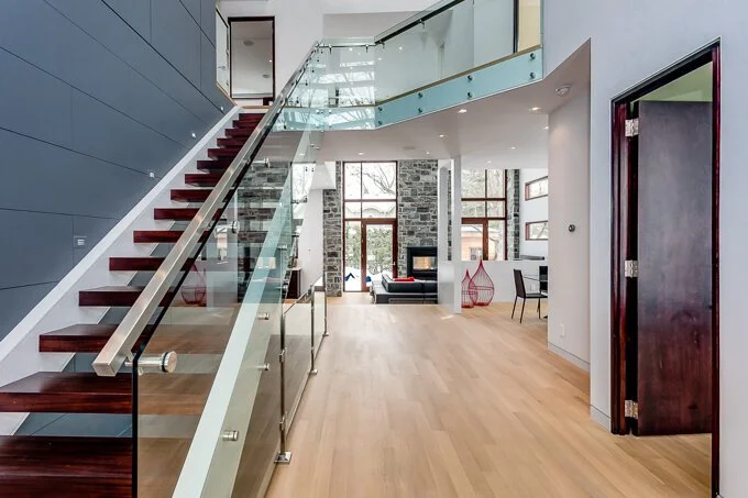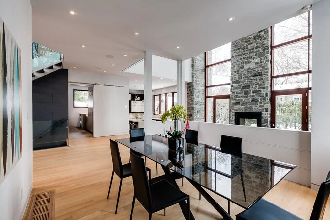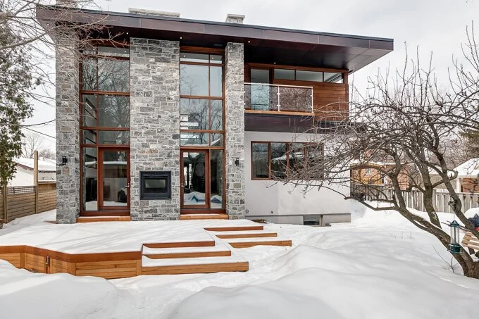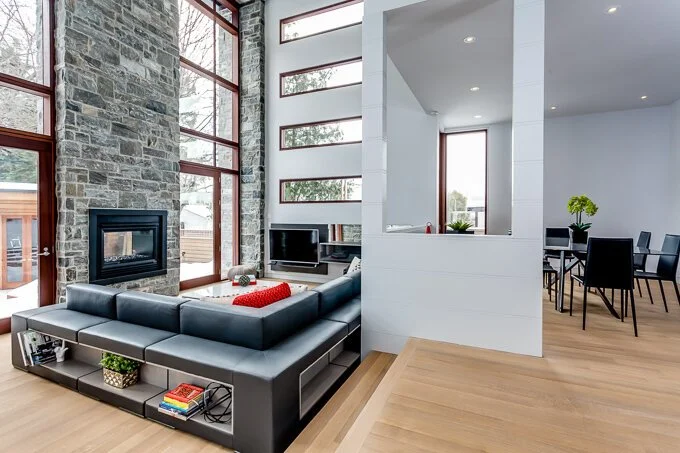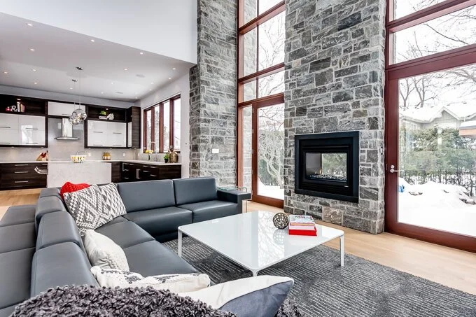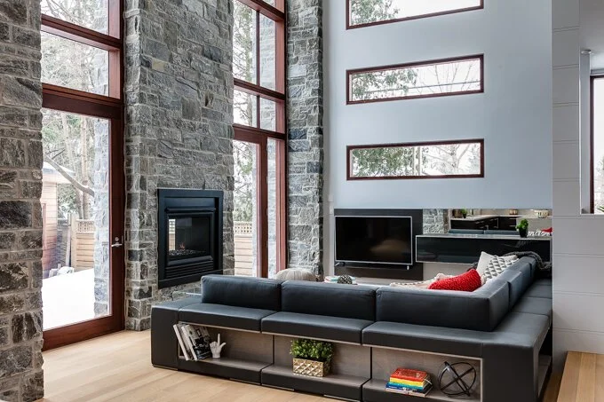 This modern rustic custom home on a quiet lot in Oakville is a stunning landmark. Asymmetrical windows and soaring ceilings are emphasized by splitface stone that continues from the exterior.