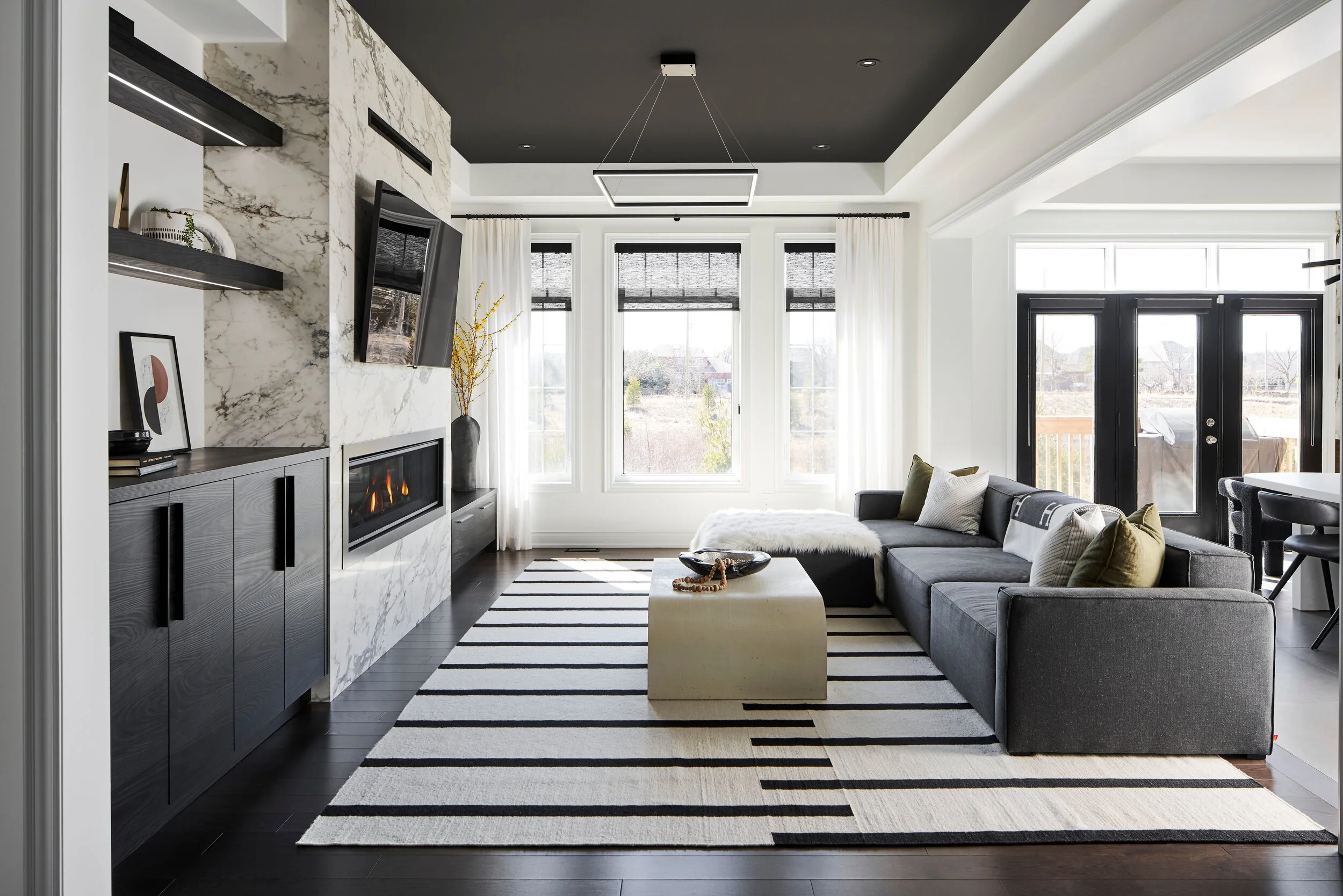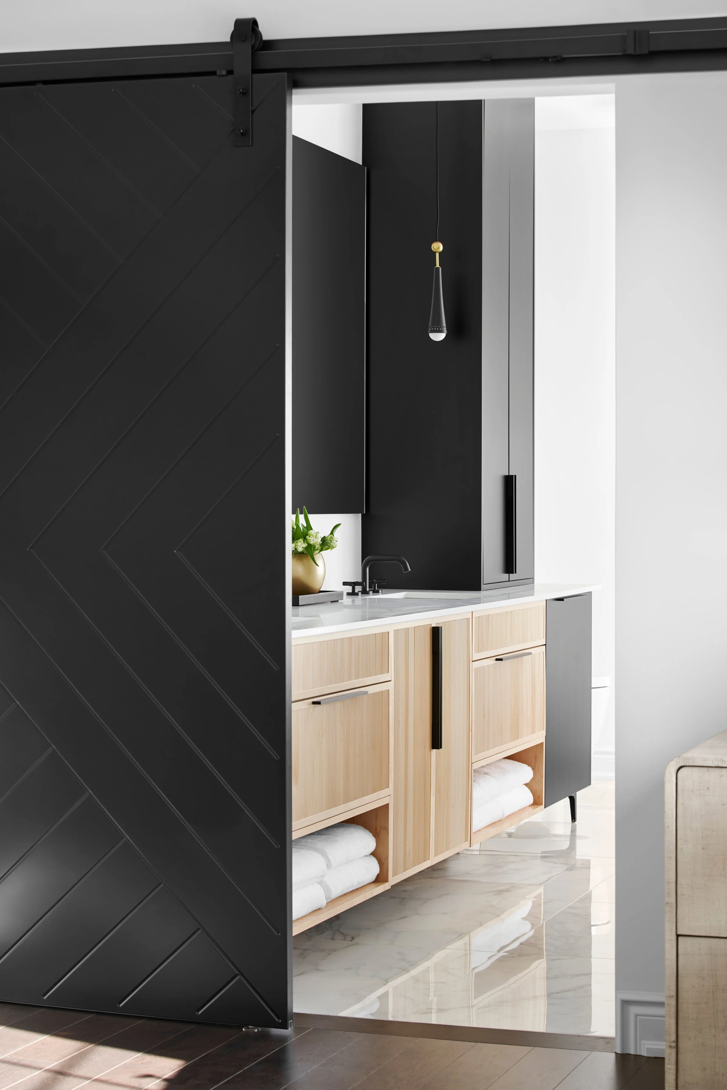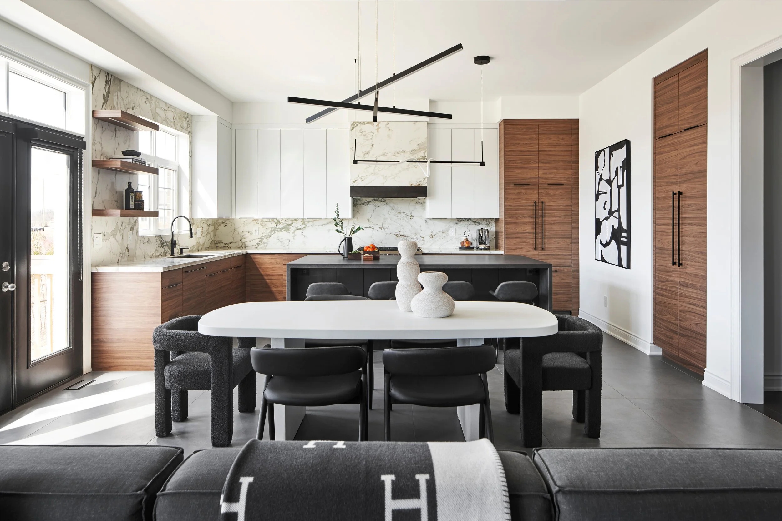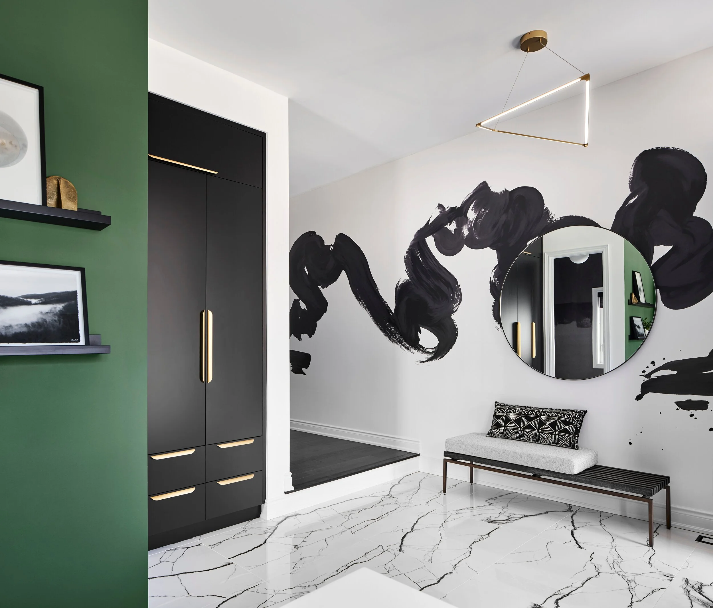 Our clients purchased a bland new build home that needed a huge infusion of character and interest. We wanted the home to reflect this young family's cool personality and be an unexpected punch when walking through the door. New finishes, fixtures and furniture all by avenue design inc.