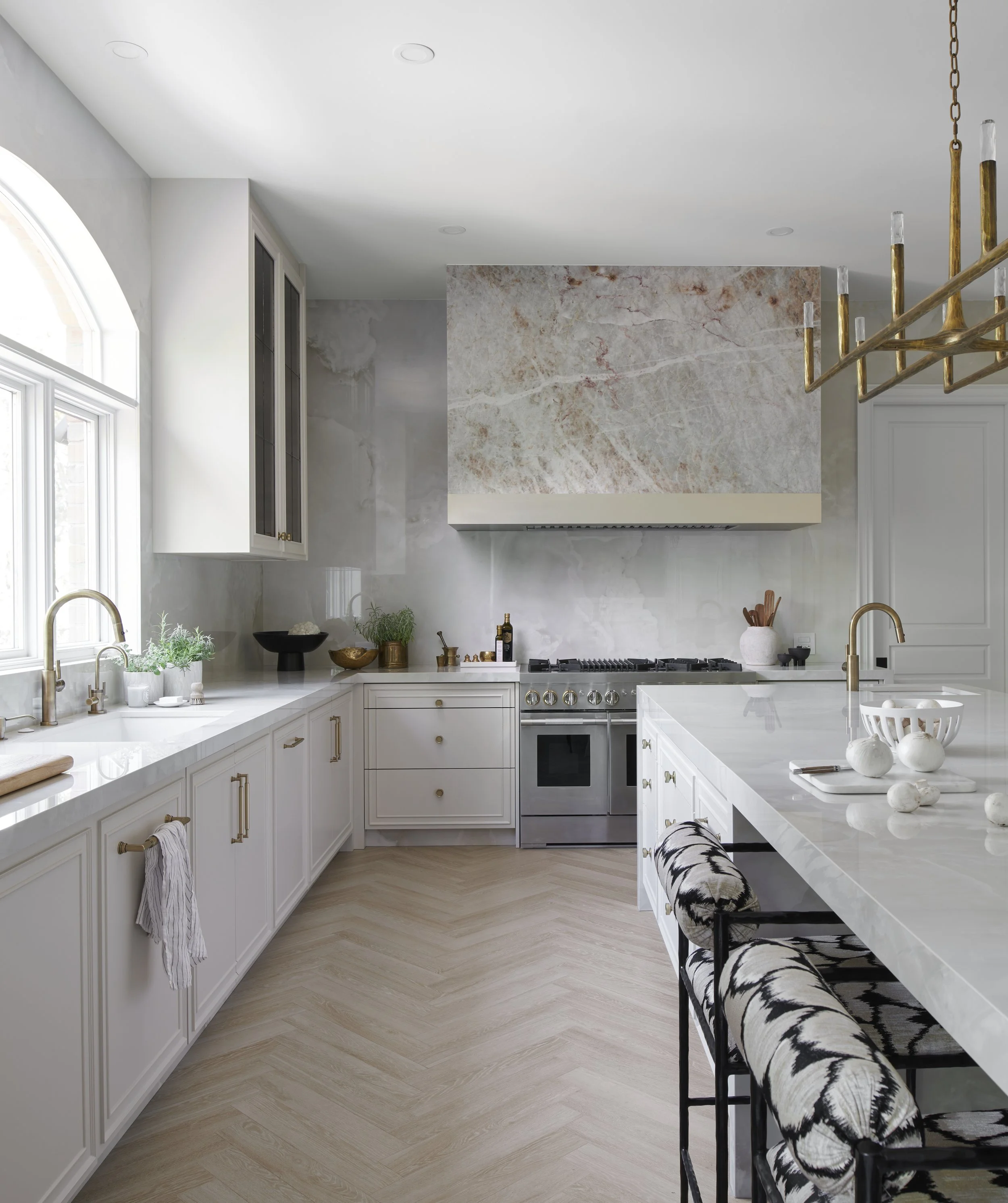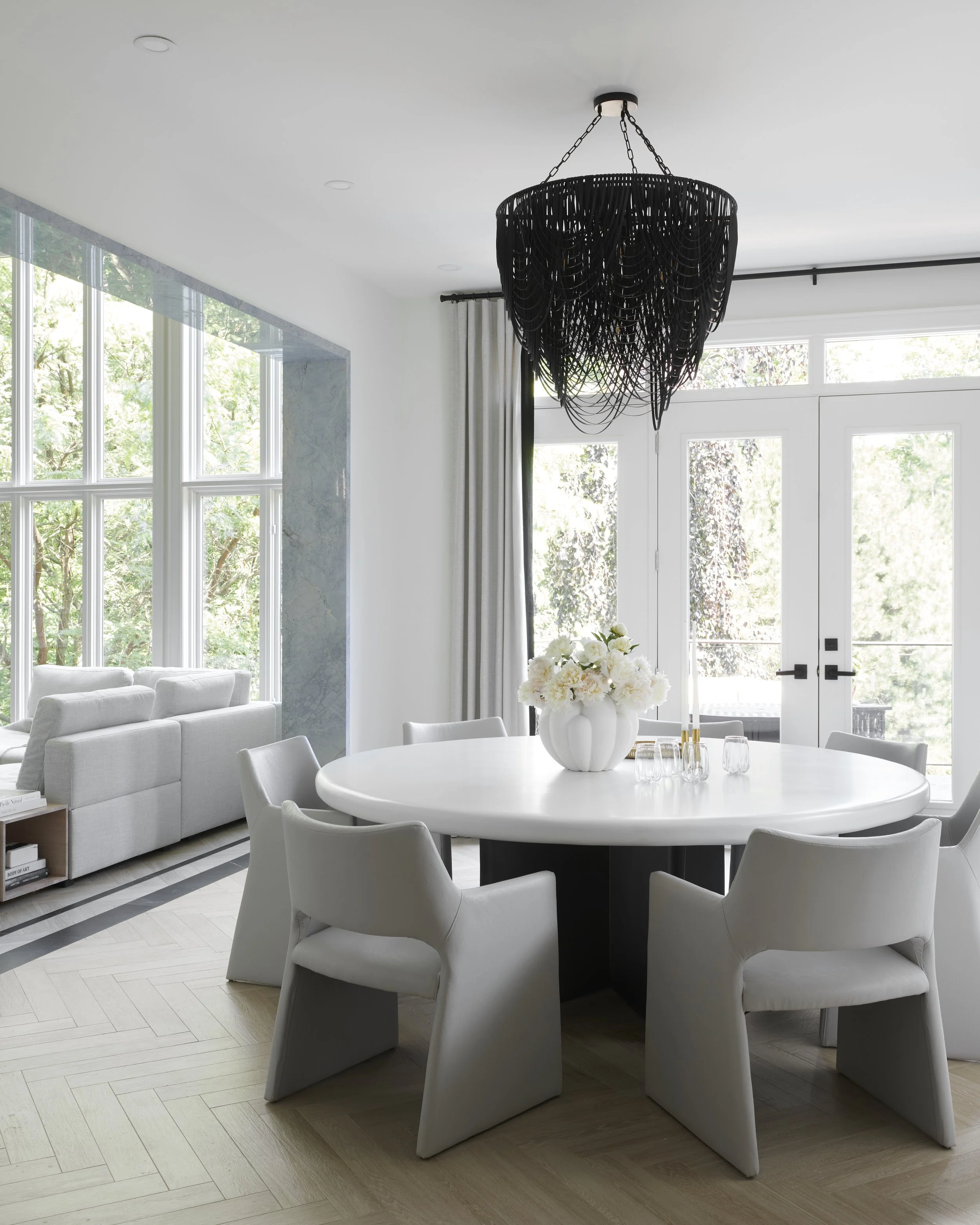 Welcome to our 5000 sq ft main floor renovation project! Our goal was to breathe new life into this outdated space, and we achieved it by creating an elegant black and white palette, which exudes sophistication. The addition of saturated tones throughout adds depth and character to the expansive rooms. Dramatic natural stones have been carefully incorporated to enhance the overall ambiance. The tone on tone kitchen not only provides ample storage and functionality but also serves as a beautiful centerpiece. The backlit onyx featured on both the kitchen hood and powder room sink makes for a striking conversation starter, leaving guests in awe of the captivating design. All finishes, fixtures and furniture by avenue design inc.