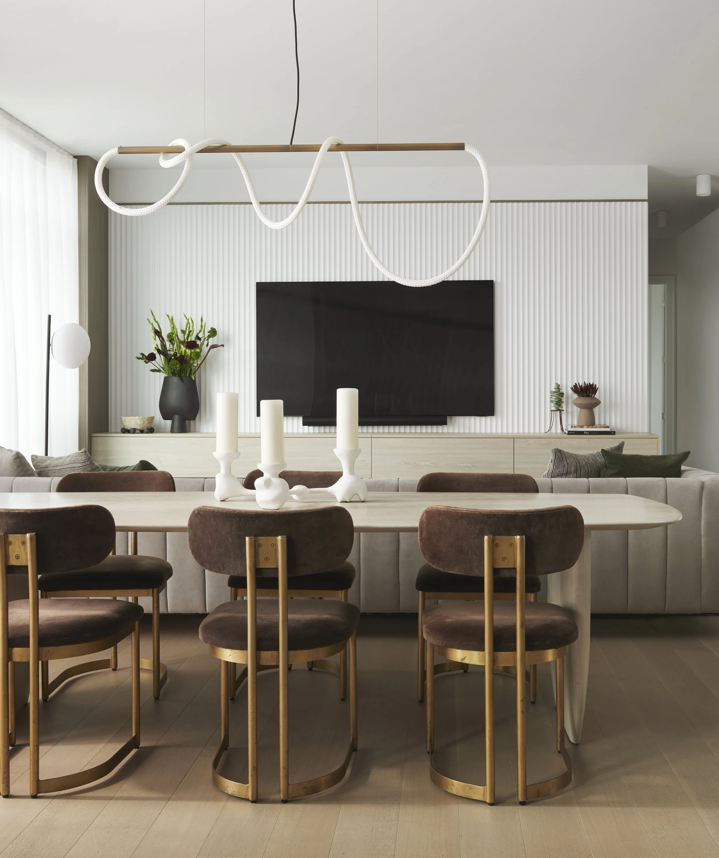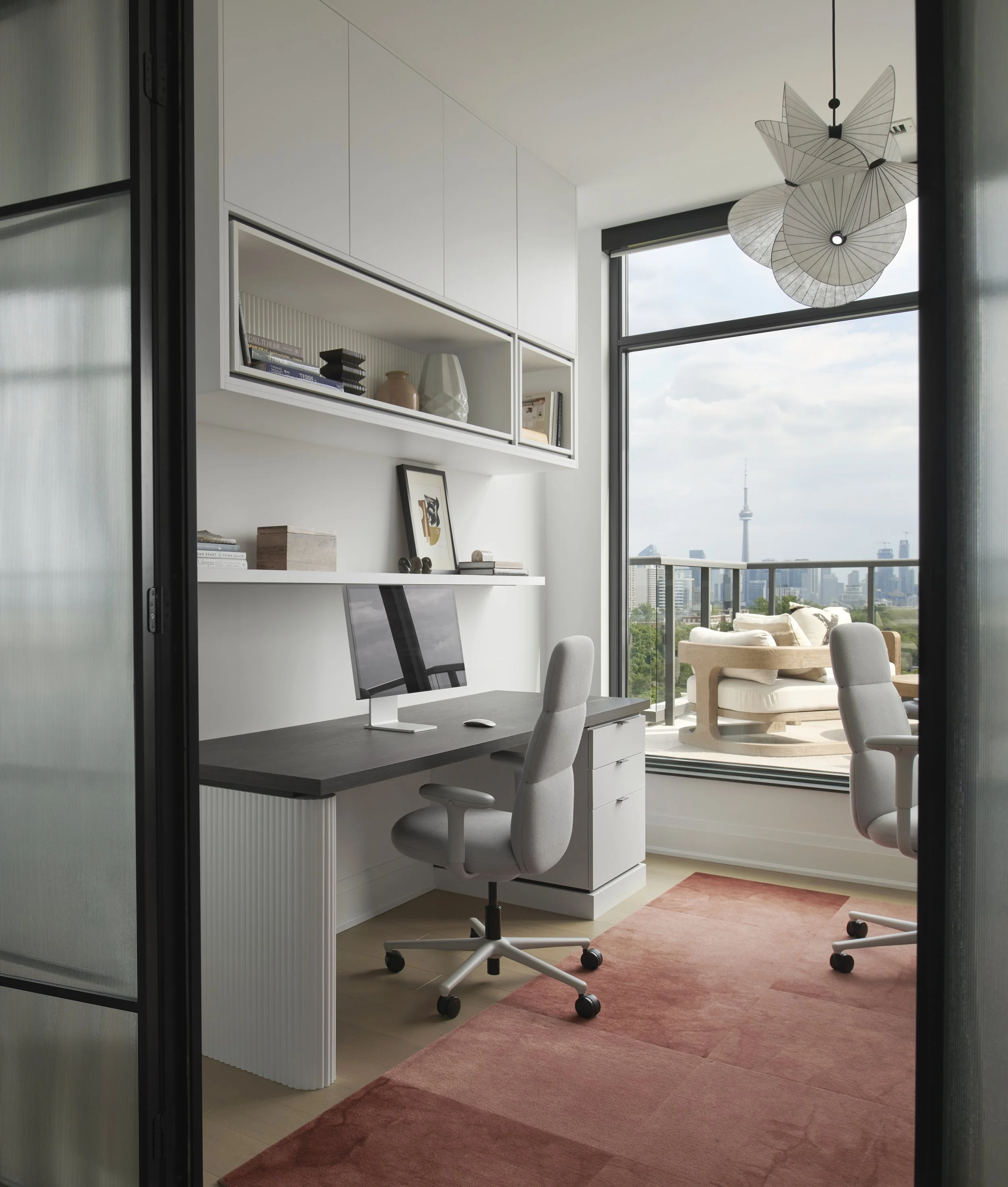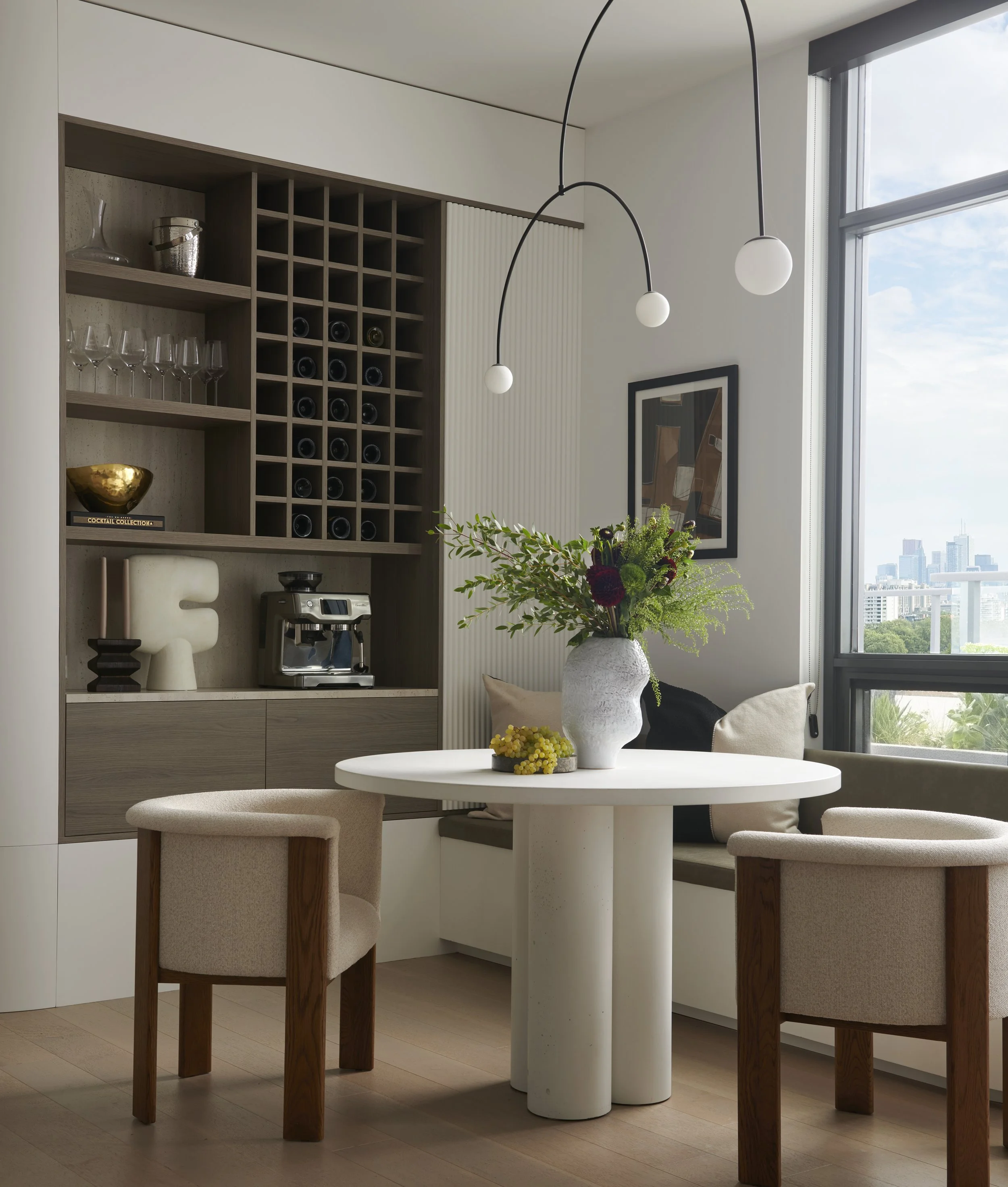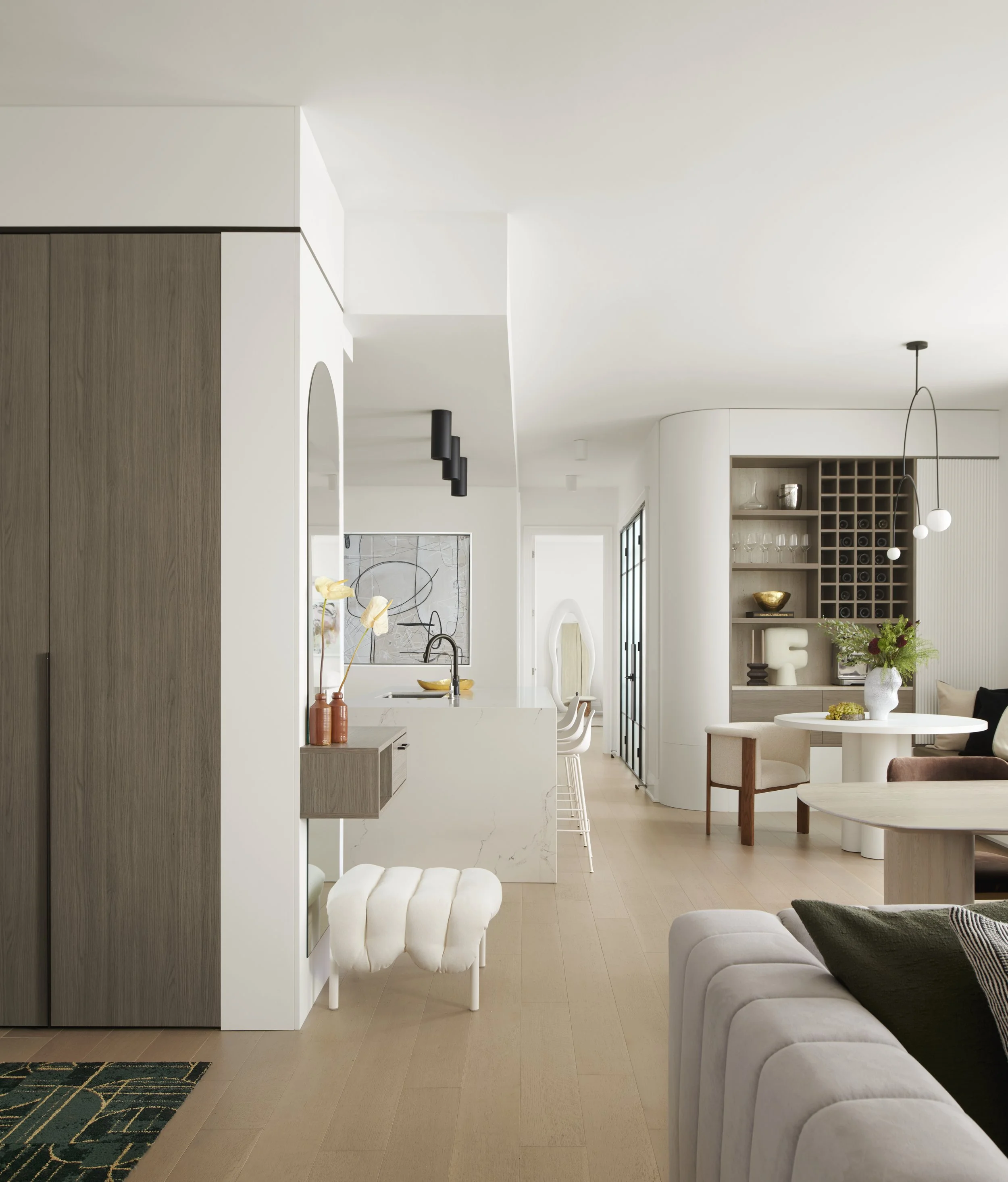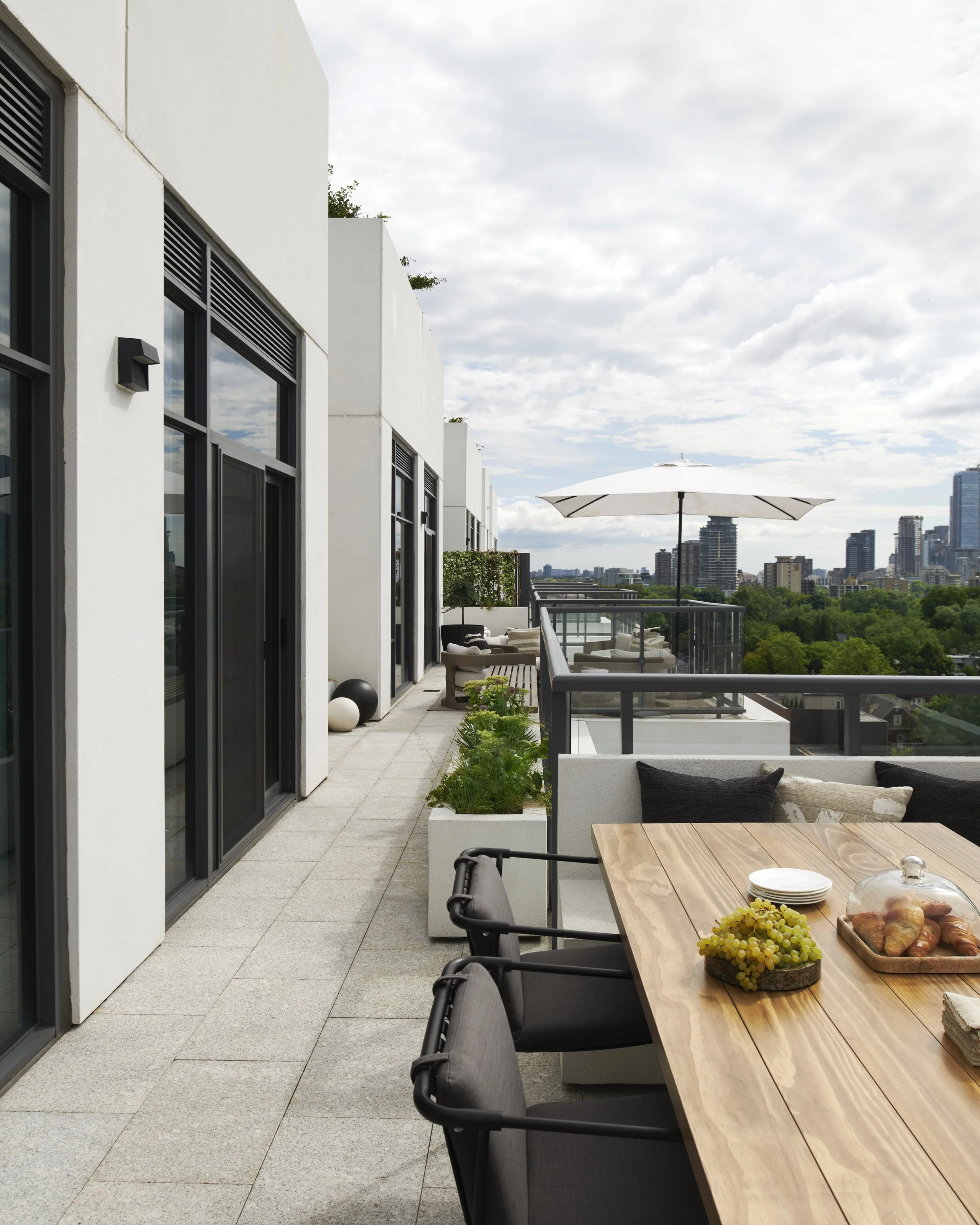 This recently designed penthouse captures the refined ambiance of a boutique hotel while offering a welcoming, family-friendly environment. Inspired by the clients' move from Dubai, the space balances a neutral palette with bold, saturated accents, creating both warmth and sophistication. Thoughtful storage solutions were integrated to maintain a clean, functional living space for a family of four and their two dogs, combining sleek design with everyday practicality. The added bonus of a large patio spanning the length of the unit allowed for an inside-out approach to living, with dedicated entertainment and lounge pods enhancing the penthouse experience.