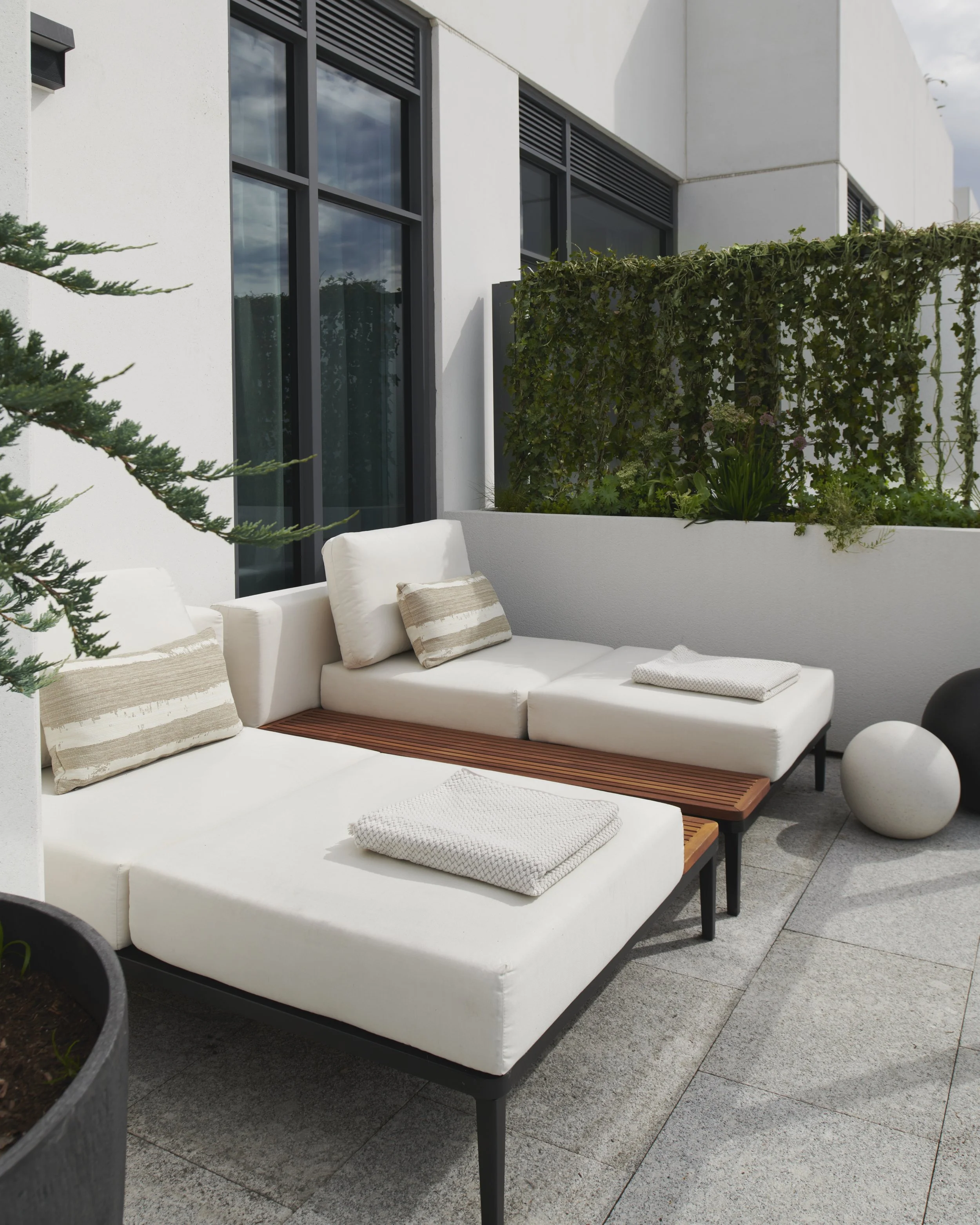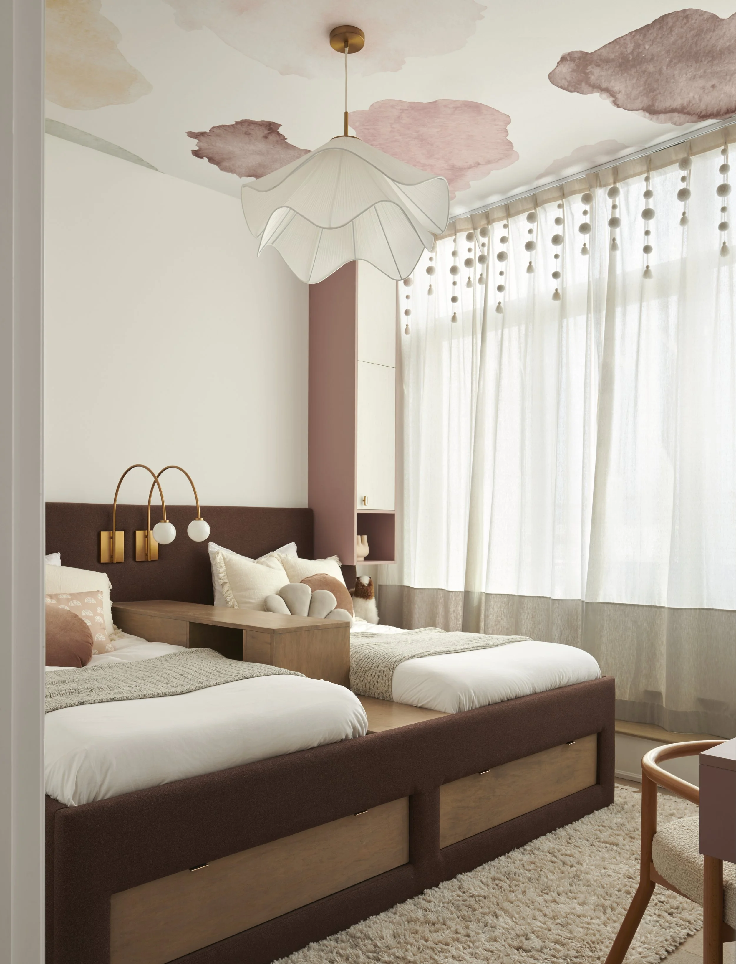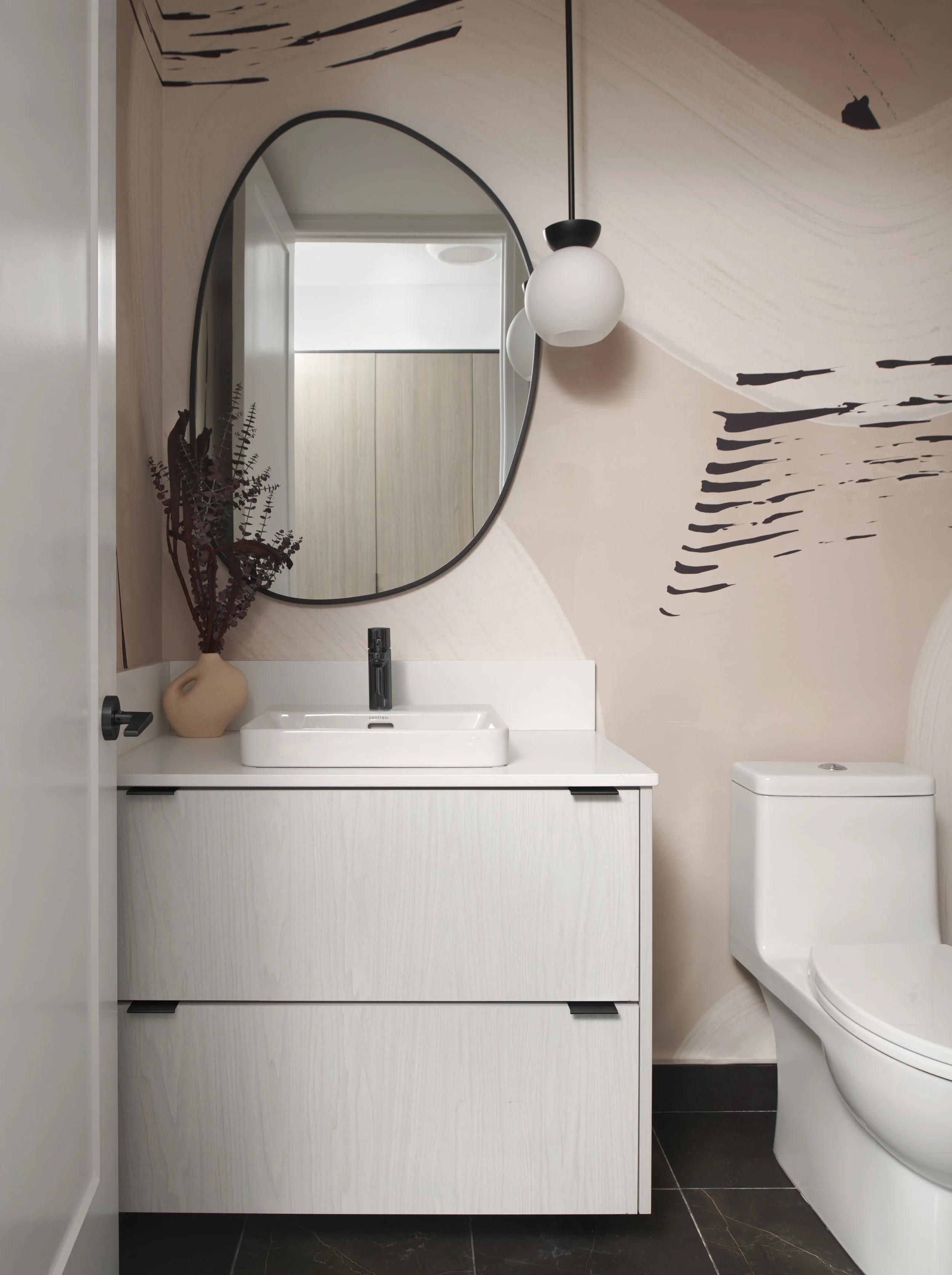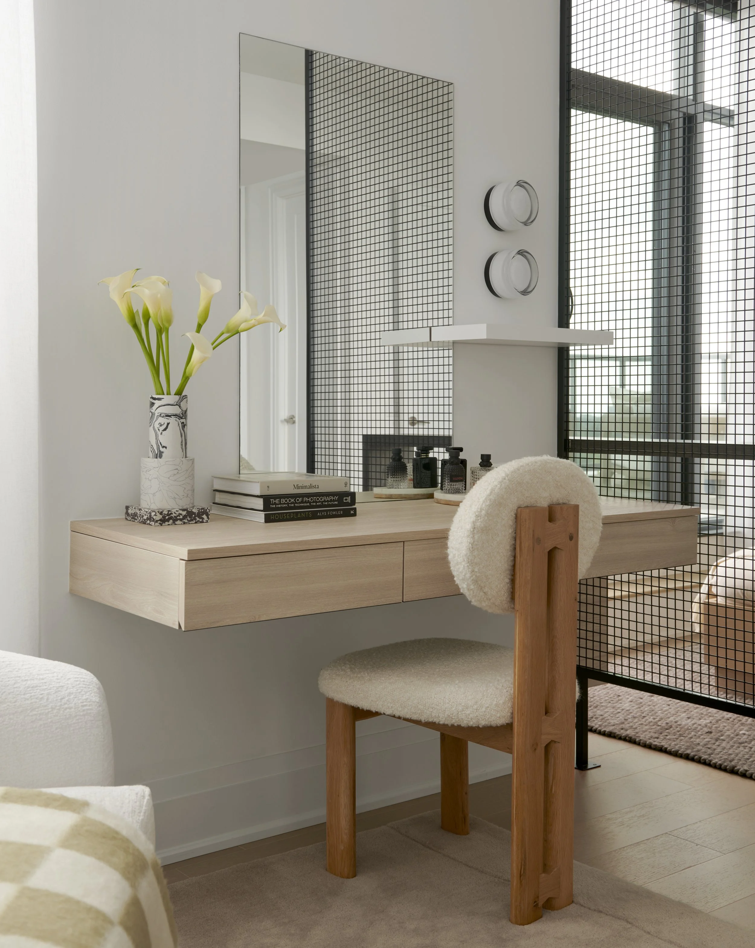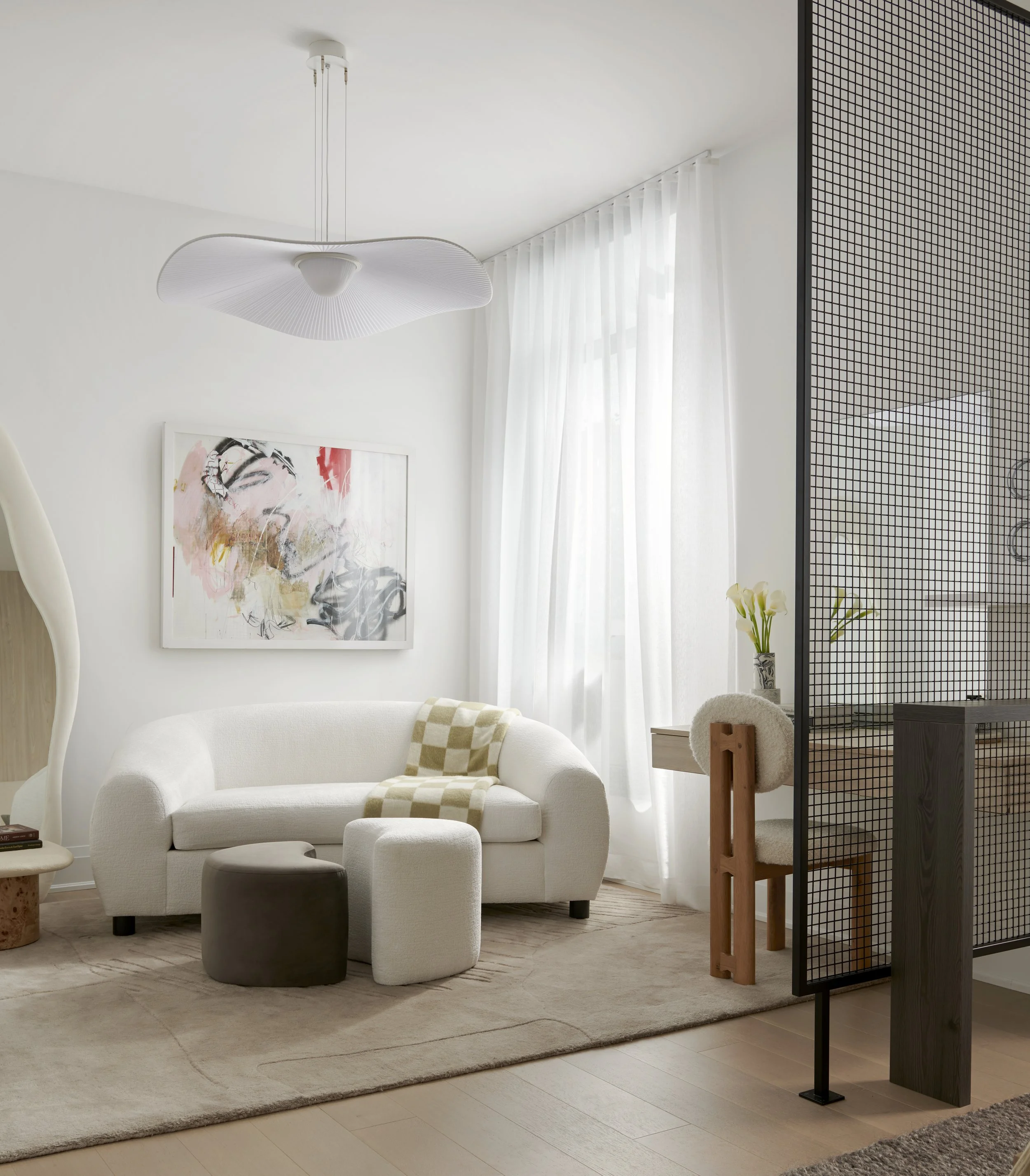 This recently designed penthouse captures the refined ambiance of a boutique hotel while offering a welcoming, family-friendly environment. Inspired by the clients' move from Dubai, the space balances a neutral palette with bold, saturated accents, creating both warmth and sophistication. Thoughtful storage solutions were integrated to maintain a clean, functional living space for a family of four and their two dogs, combining sleek design with everyday practicality. The added bonus of a large patio spanning the length of the unit allowed for an inside-out approach to living, with dedicated entertainment and lounge pods enhancing the penthouse experience.