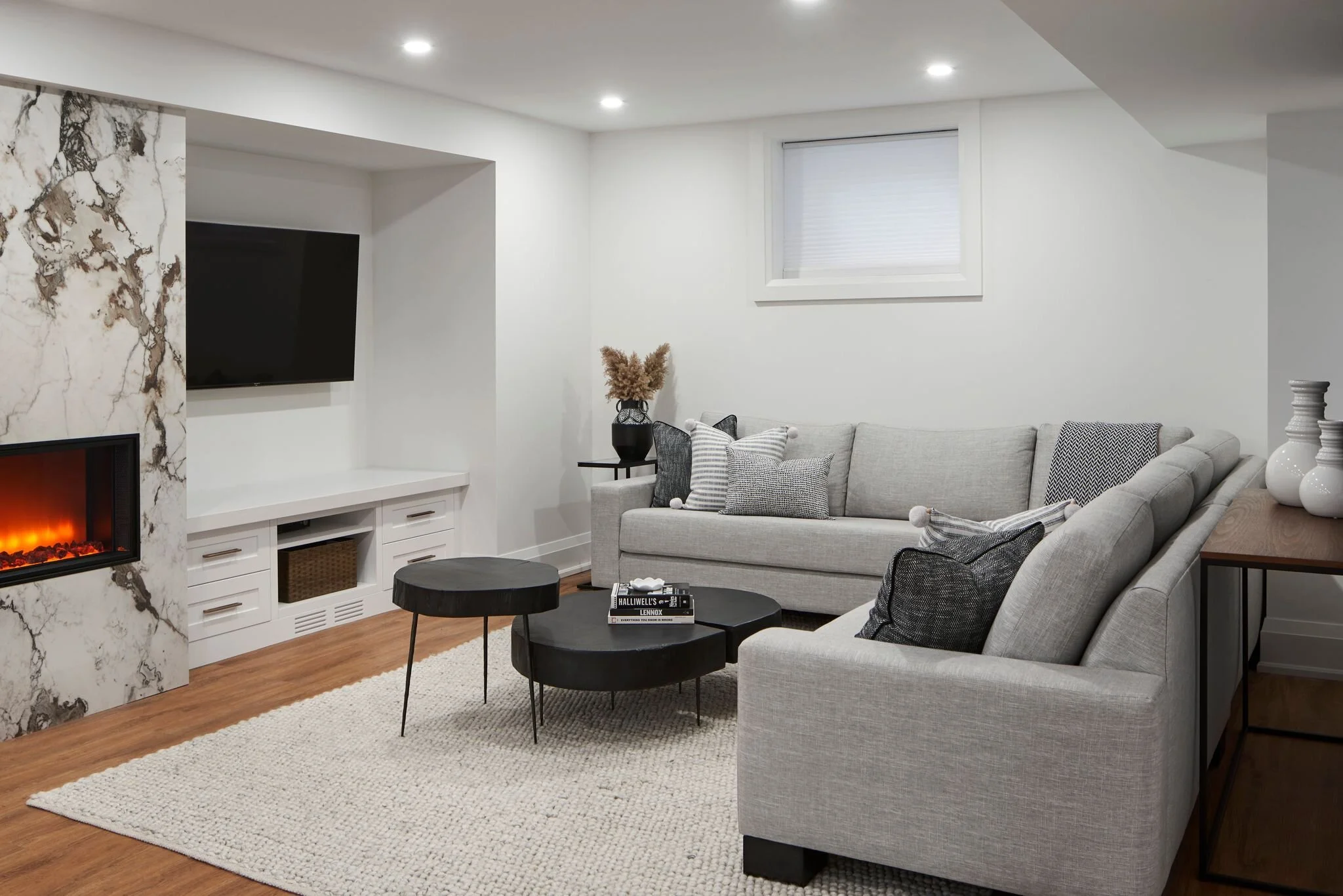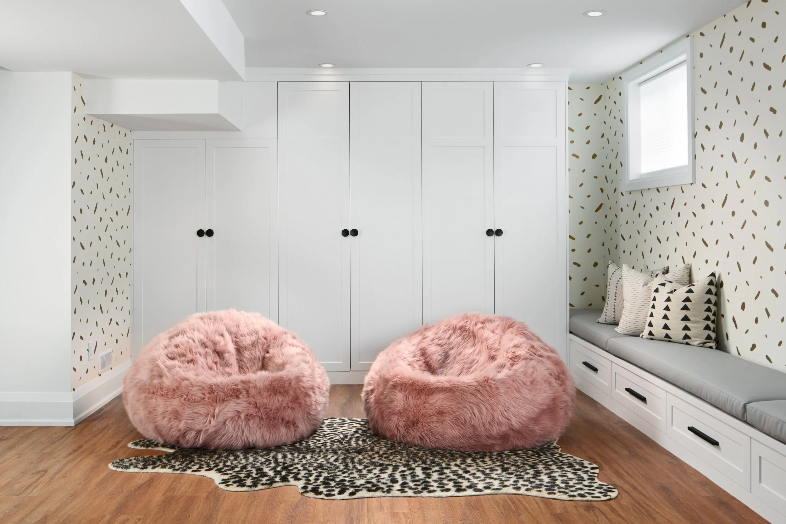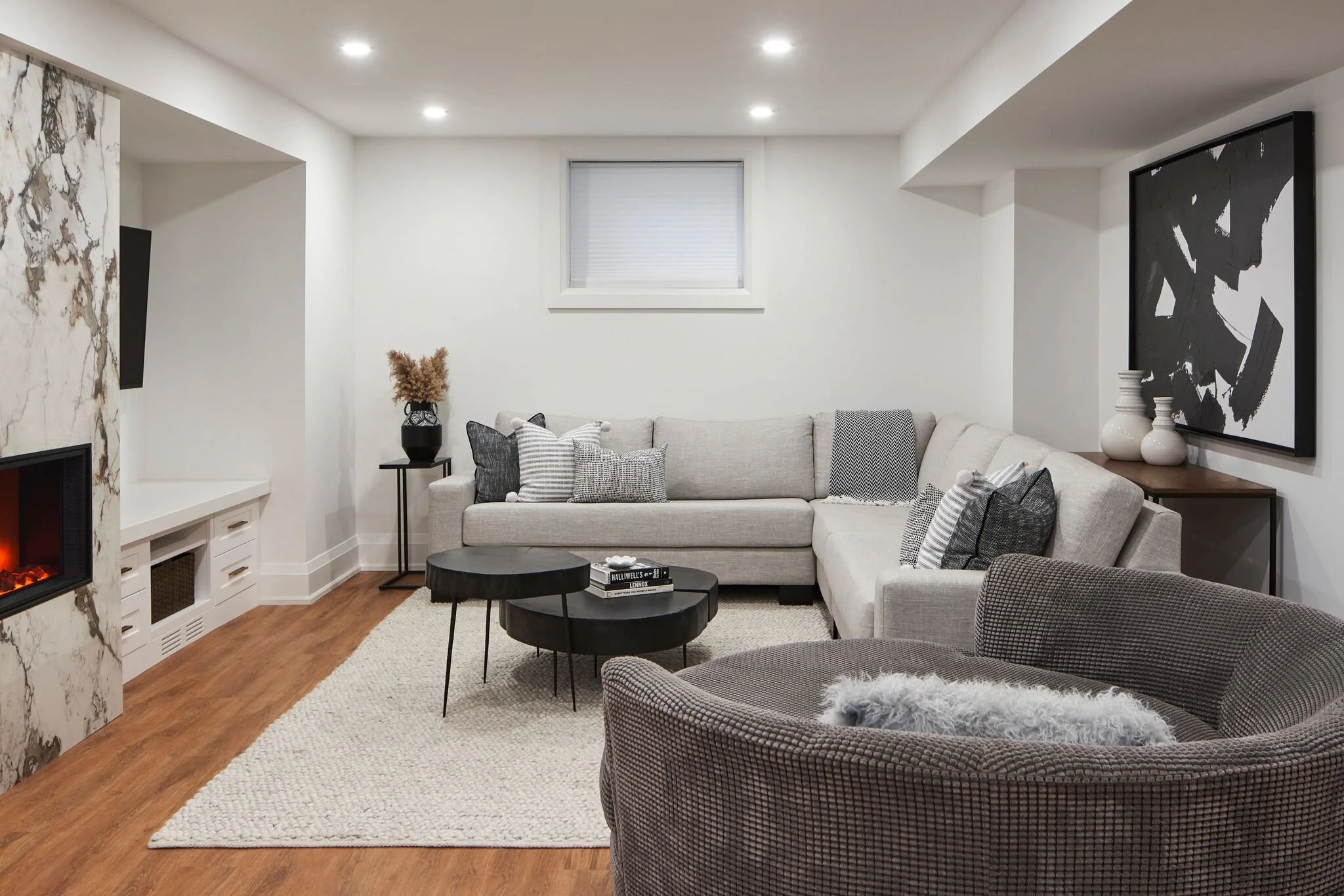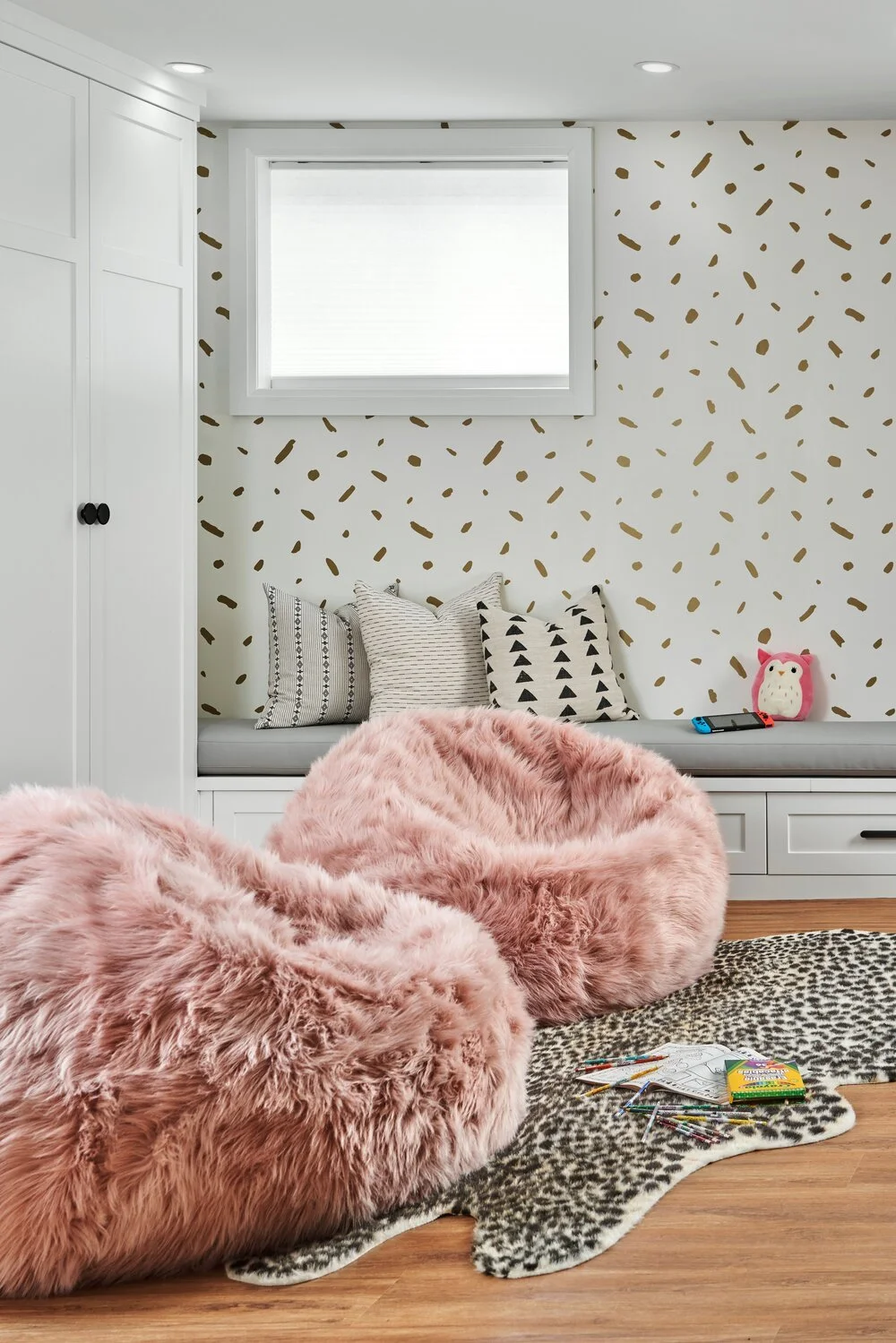 An unfinished basement was carefully planned to add much needed living space for this family of 4. The finished basement now features a family room, playroom, laundry room, bathroom, gym area, and plenty of storage space. The intent of the design was to create a calm but fun space for both adults and young children. All finishes, furniture and fixtures by avenue design inc.