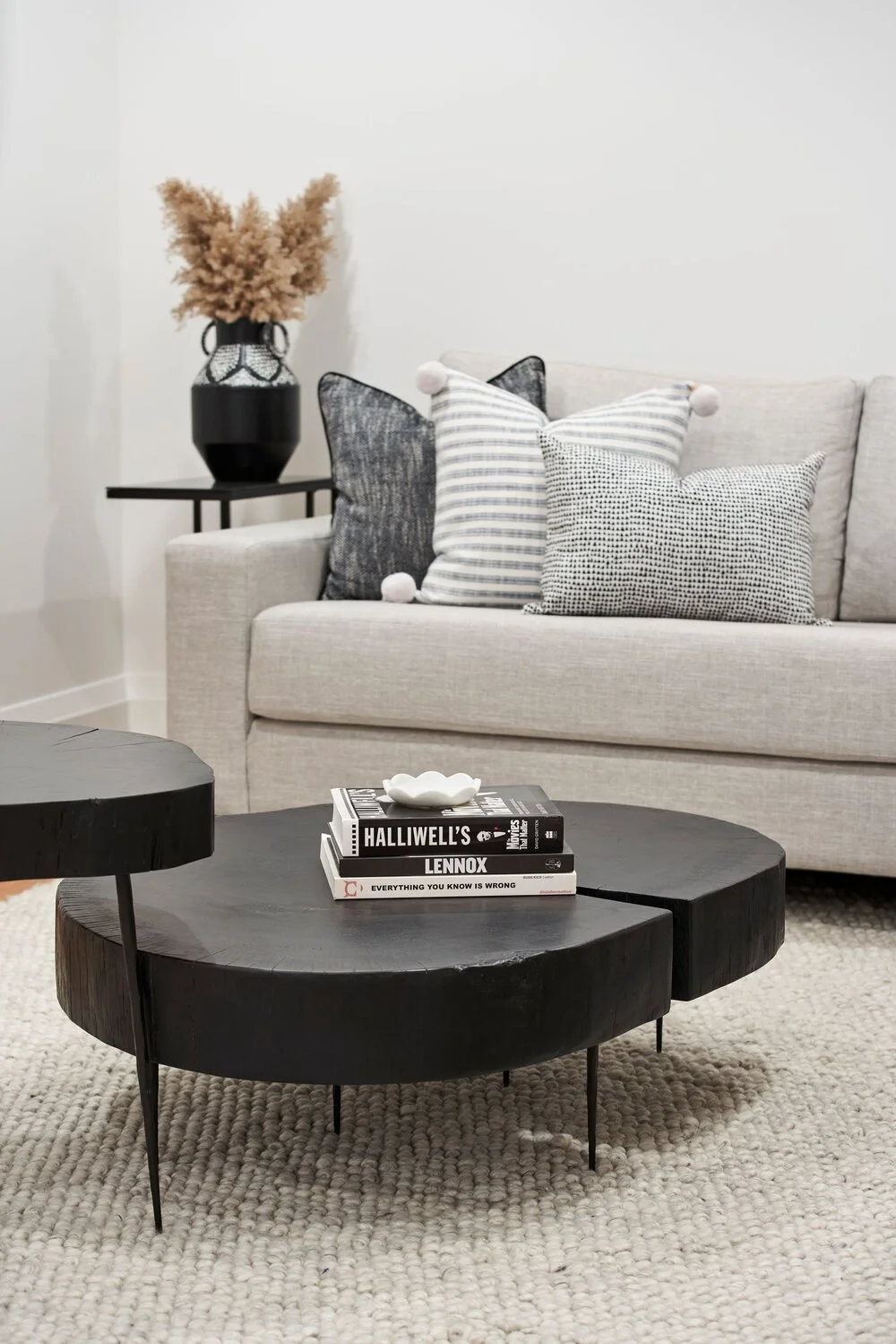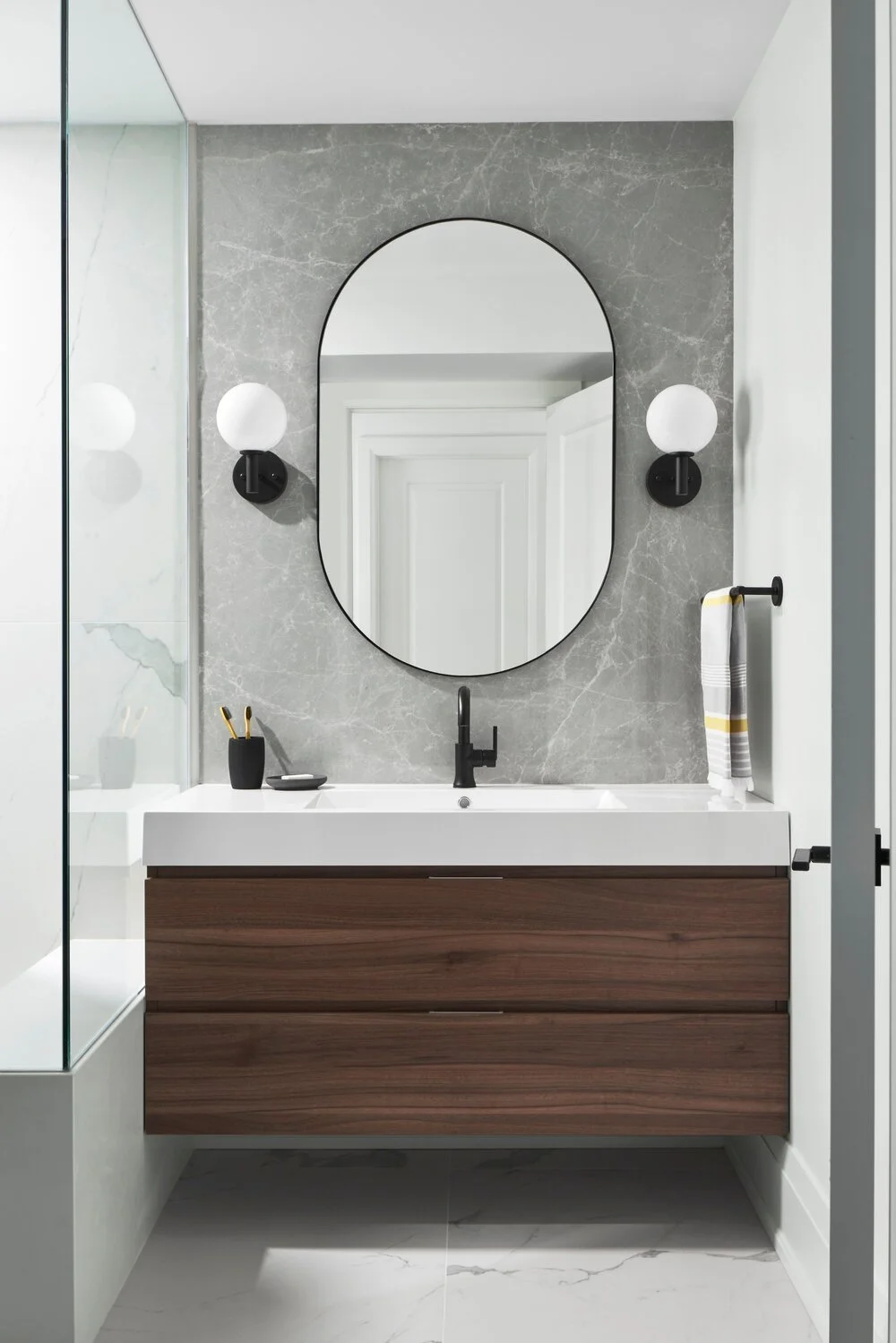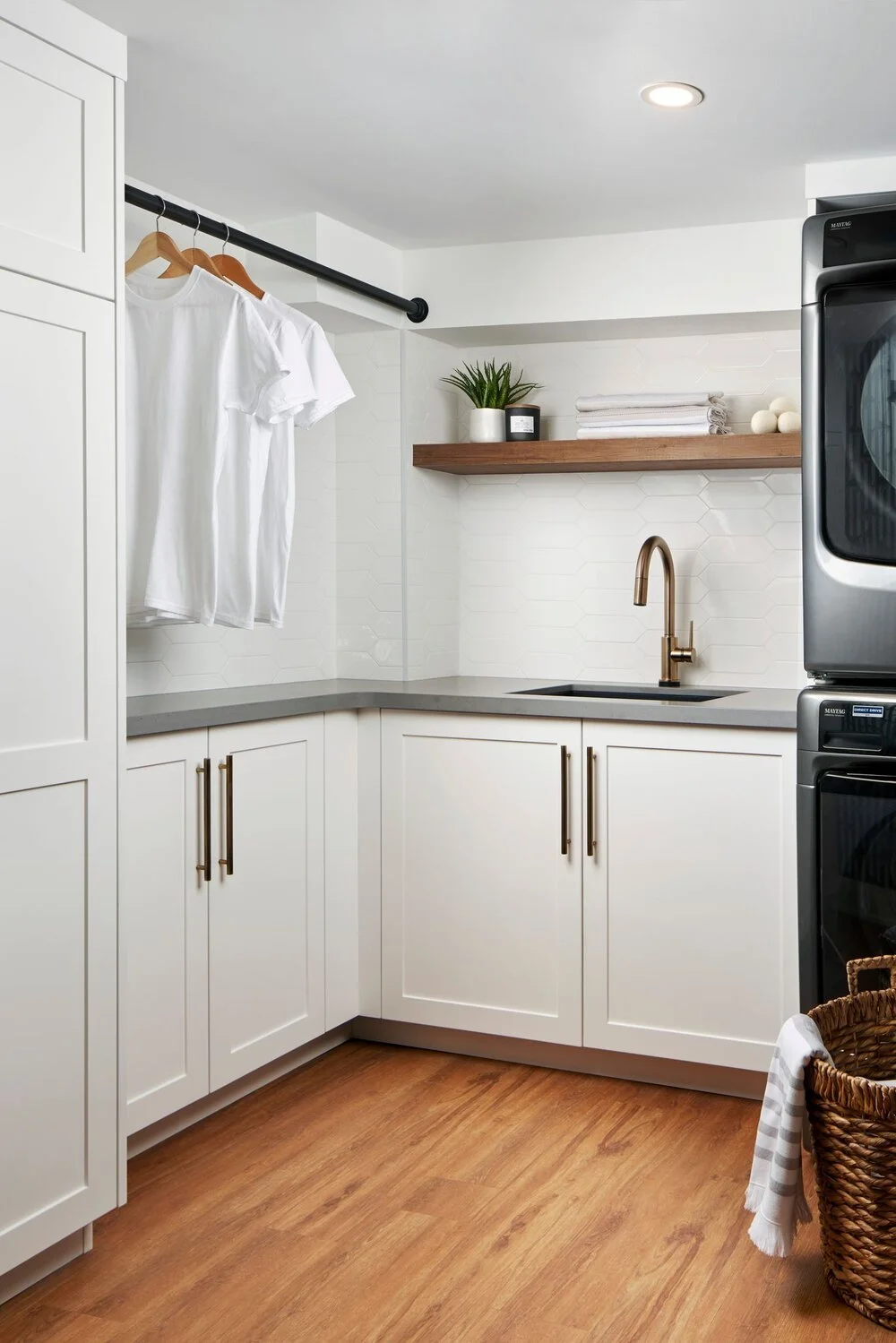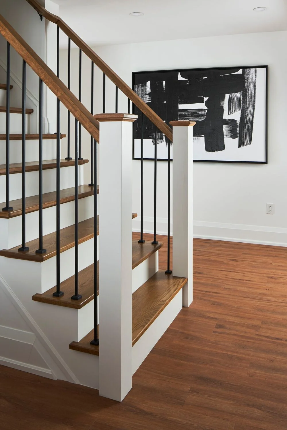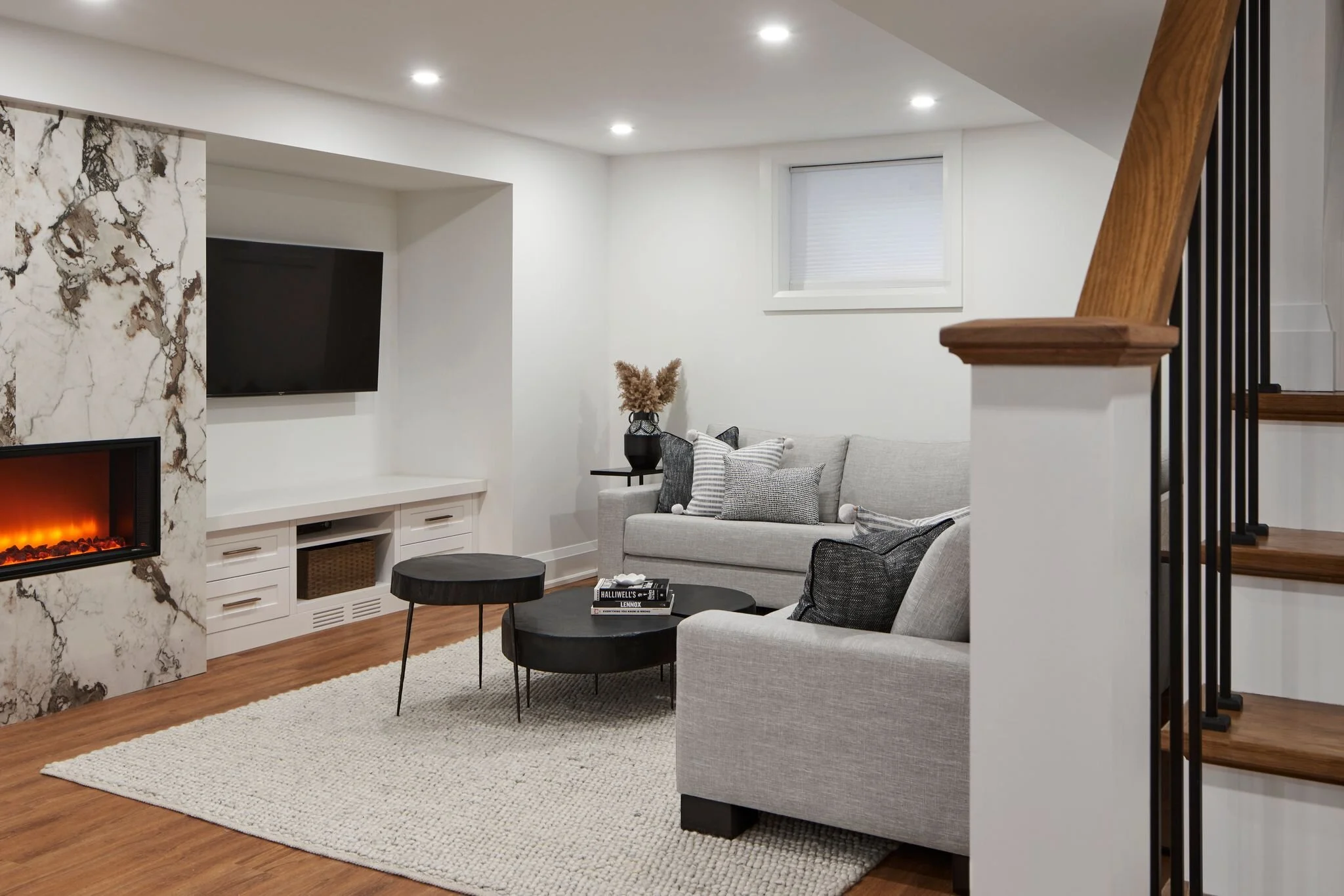 An unfinished basement was carefully planned to add much needed living space for this family of 4. The finished basement now features a family room, playroom, laundry room, bathroom, gym area, and plenty of storage space. The intent of the design was to create a calm but fun space for both adults and young children. All finishes, furniture and fixtures by avenue design inc.